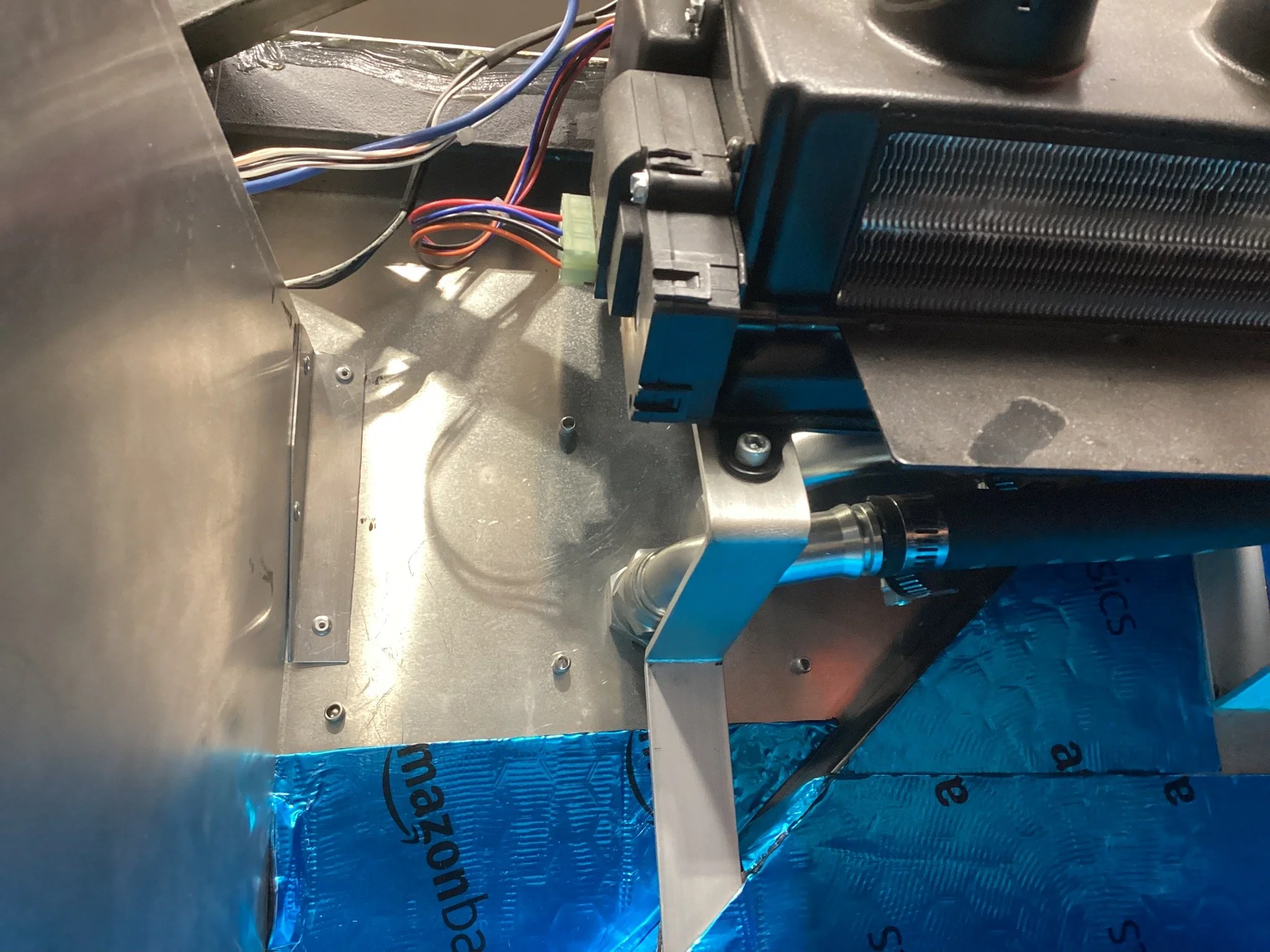 Custom mounting brackets for HVAC unit and interior view of bulkhead fittings for coolant lines